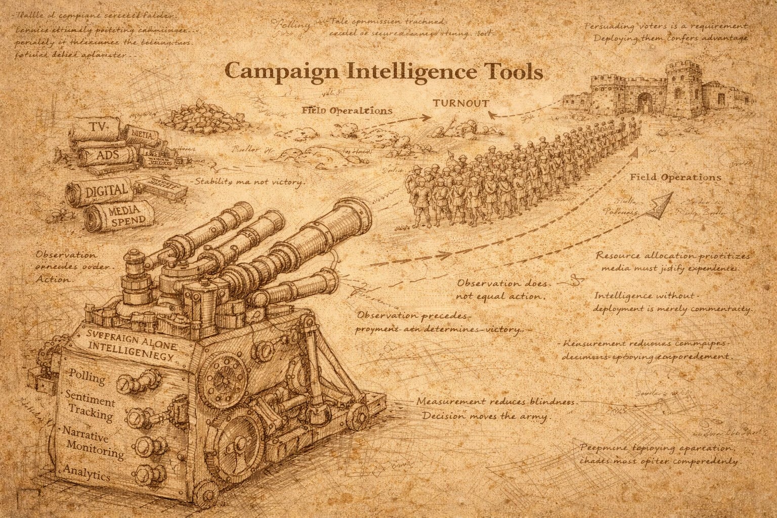 Campaign intelligence is enormously valuable. Monitoring systems reveal narrative shifts. Polling confirms stabilization. Analytics illuminate persuasion opportunities.