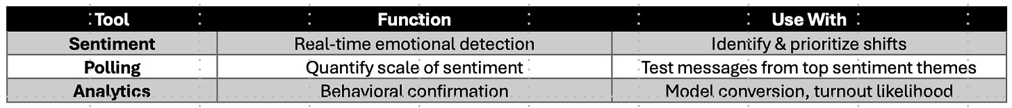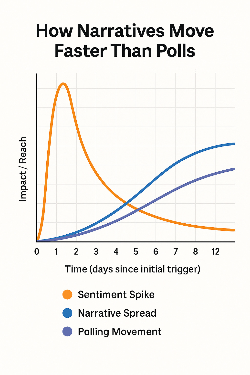 [Sentiment Moves] → [Narrative Forms] → [Polling Detects] → [Campaign Reacts]But the best teams invert the model: