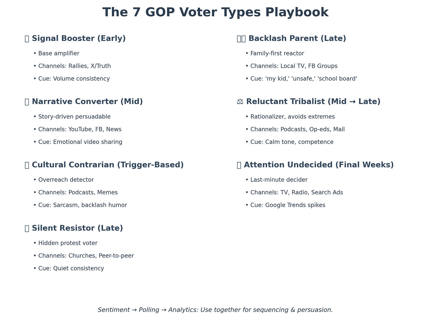 This post is the field guide: a one-stop playbook campaigns can use to plan, execute, and adapt strategy around the 7 voter types.